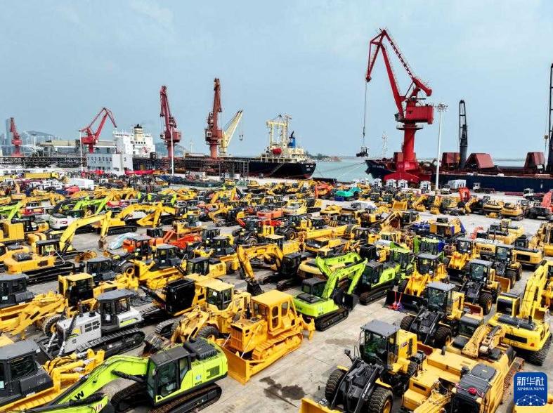 7月13日,在江蘇省連云港港東方港務分公司碼頭,大批出口機械集港等待裝船(無人機照片)。