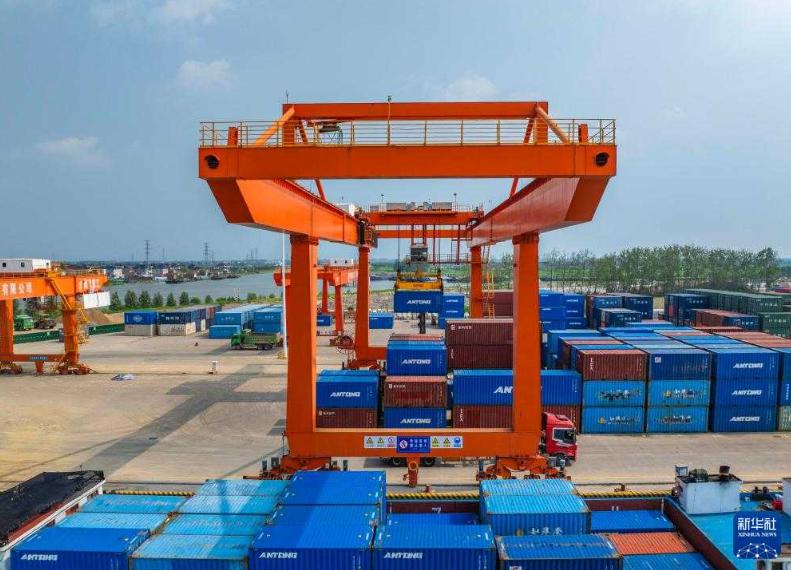 7月13日,貨船在江蘇省興化經濟開發區的(中交)興化港口泊位上裝卸集裝箱(無人機照片)。