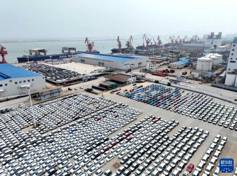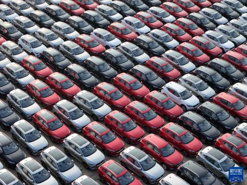 7月10日,出口汽車在山東港口煙臺港集結等待裝船(無人機照片)。