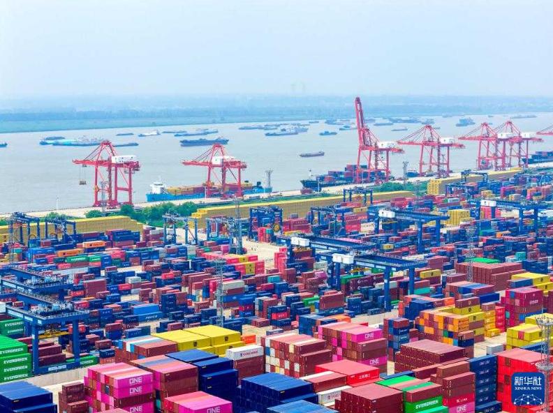 這是在江蘇南京龍潭港集裝箱碼頭拍攝的等待裝船的集裝箱(7月10日攝,無人機照片)。